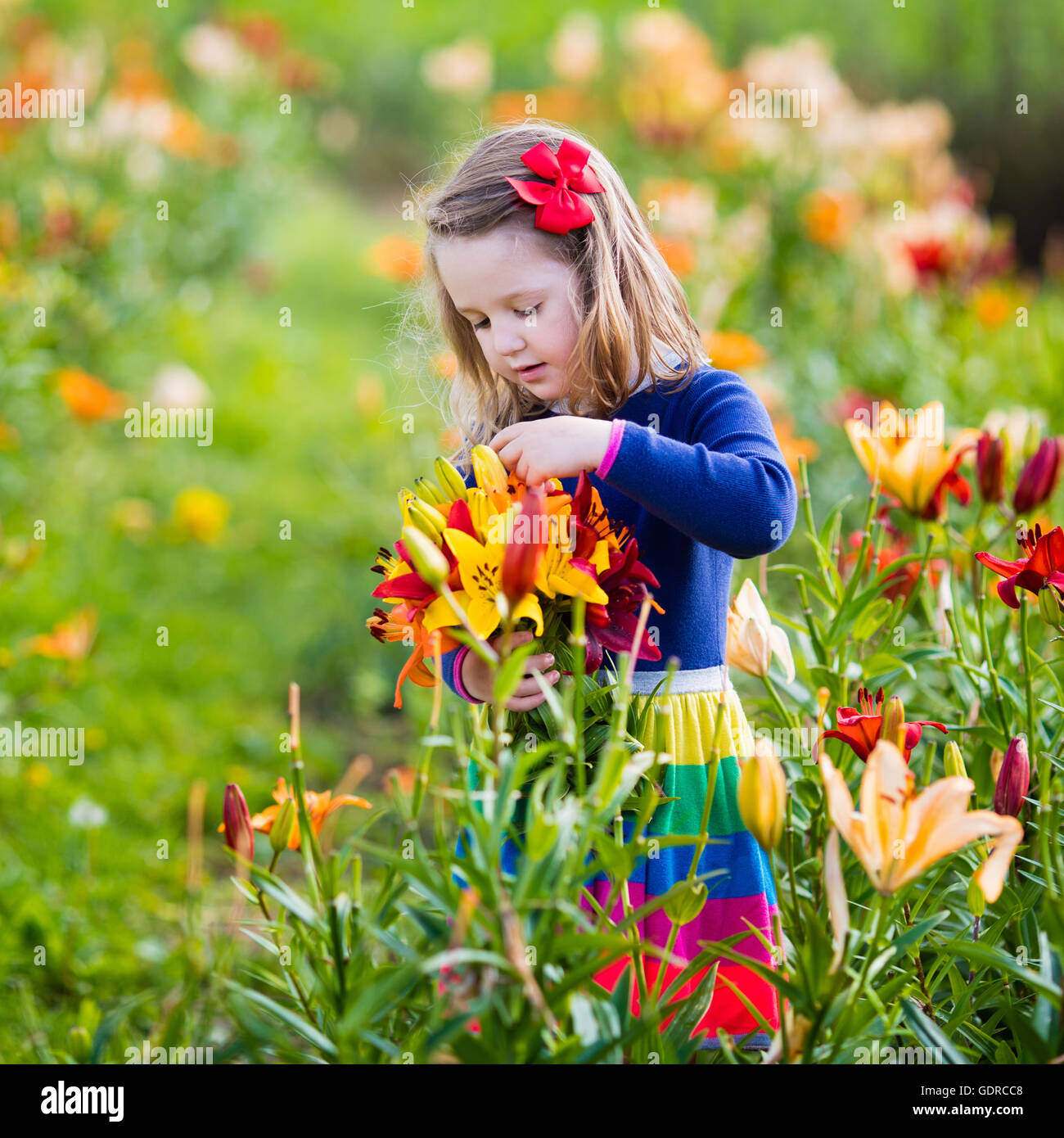 Cute little girl picking lily flowers in blooming summer garden Stock Photo - Alamy