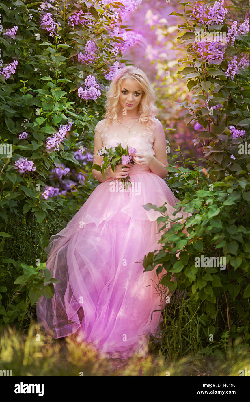 Beautiful woman enjoying lilac garden, young woman with flowers in Stock Photo - Alamy