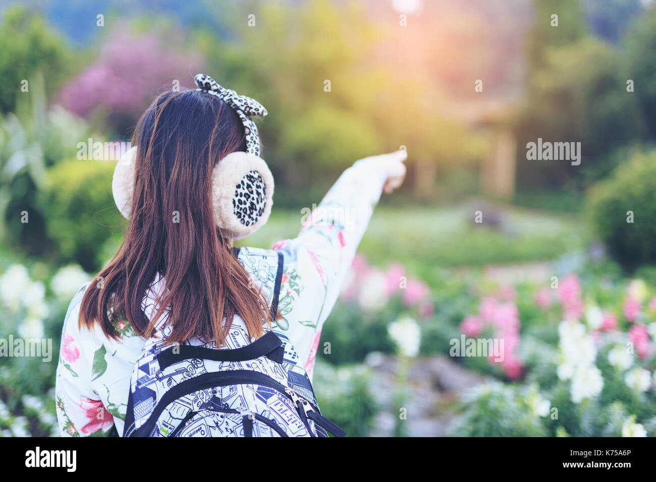 woman Beautiful Girls point to something at the flower garden Stock Photo - Alamy